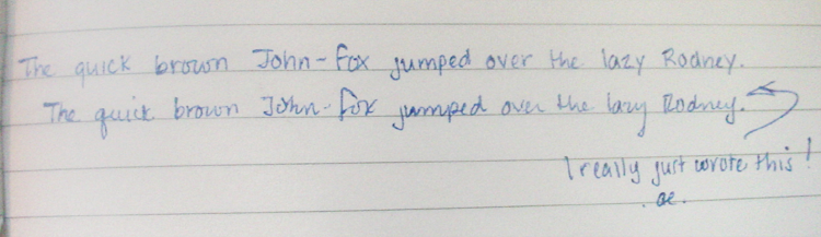siriaeve has just remarked how neat my handwriting is. Actually, this is, for me, very sloppy handwriting :D Most of the time it is strict, regimented, and very tiny... Part of the reason I love Moleskines so much is that the lines are perfect for writing small. Here is my not-sloppy handwriting: The quick brown John-fox jumped over the lazy Rodney.